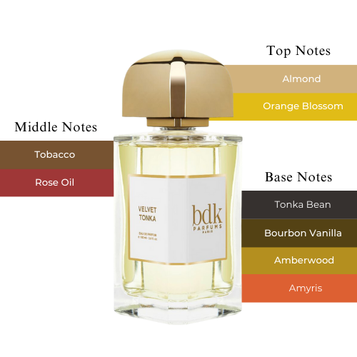Velvet Tonka by BDK Parfums is a Floral fragrance for women and men. This is a new fragrance. Velvet Tonka was launched in 2021. The nose behind this fragrance is Alexandra Carlin Velvet Tonka is characterized by its trilogy of tonka bean, orange blossom and almond. When worn on the skin, it coats it like an oriental delicacy dusted with icing sugar. The balmy tonka bean is adorned with almonds and rose petals for a velvety touch, and with a hint of tobacco absolute to give it a honeyed feel. In the base, addictive notes of milky amyris wood unfurl, enhanced by ambroxan and vanilla absolute for an unparalleled velvetiness and sensuality.