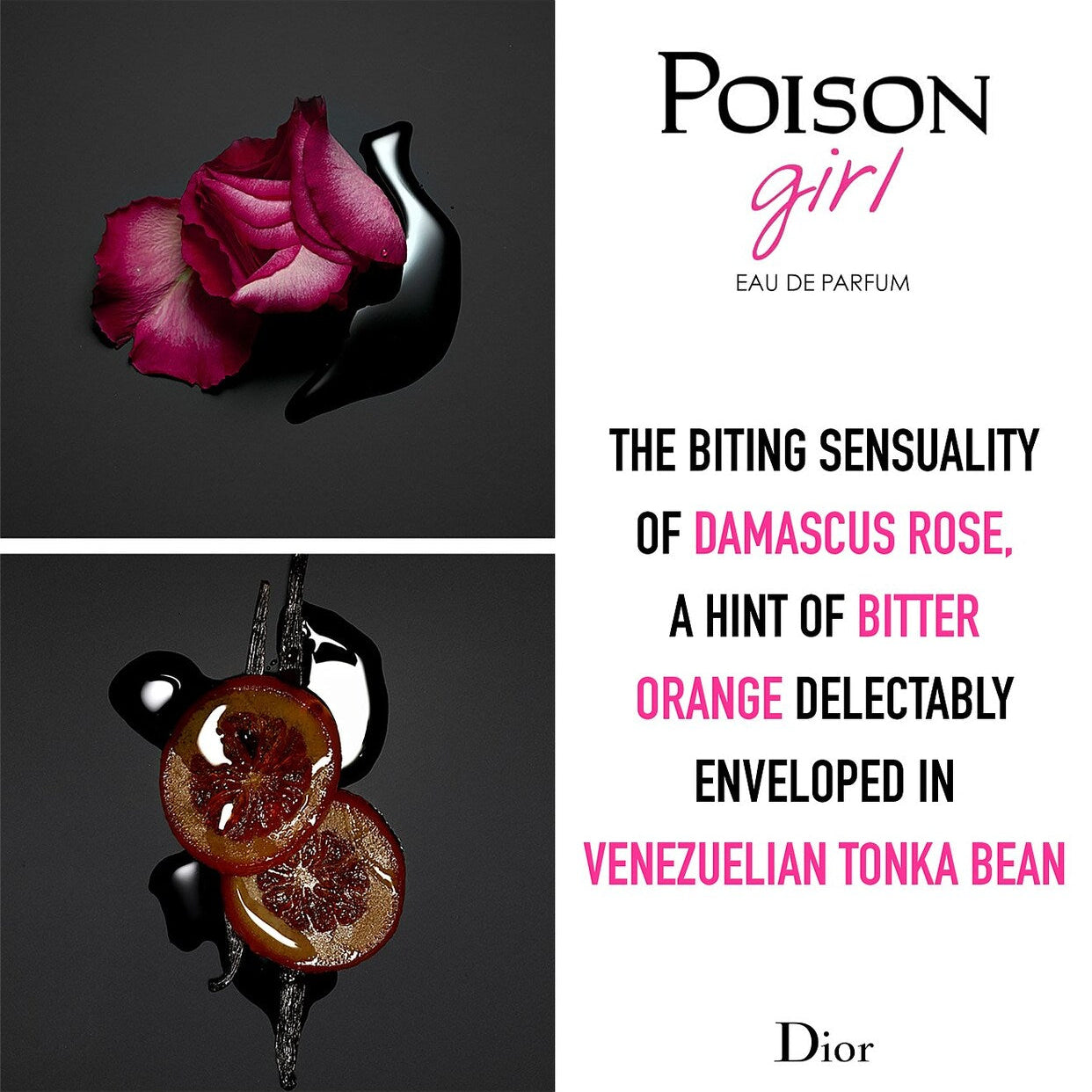 Poison Girl Eau de Toilette is an olfactory composition with a distinctive beat. An appeal to the senses in three movements that plays with a bold encounter between contrasting raw materials. A duo of Frosted Orange engaged in a dialogue, juicy non-identical twins with complementary accents. The fragrance follows with a bouquet of sensual flowers that create a fiery climate of hot and cold. Finally, ever-present in the sensual and addictive signature of Poison Girl, notes of Tonka Bean and Vanilla distill their racy, bitter-sweet caress.