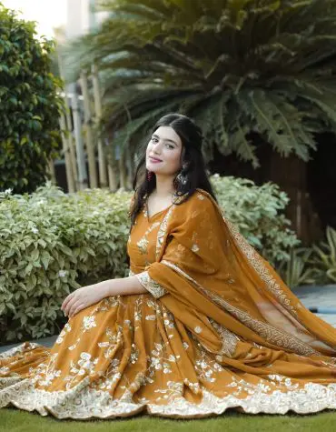 Elevate your elegance with the Elegant Ivory Embroidered Anarkali Suit with Floral Motifs . Crafted from premium faux georgette, this suit features exquisite embroidery and delicate floral motifs that add a touch of sophistication. The inner lining is made of soft micro cotton, ensuring comfort. The Anarkali suit is semi-stitched, allowing for a customized fit up to size 44. Paired with a matching dupatta adorned with intricate embroidery and lace border, this ensemble is perfect for festive occasions, weddings, and celebrations. Embrace the charm and grace of this beautiful Anarkali suit and make a statement wherever you go.