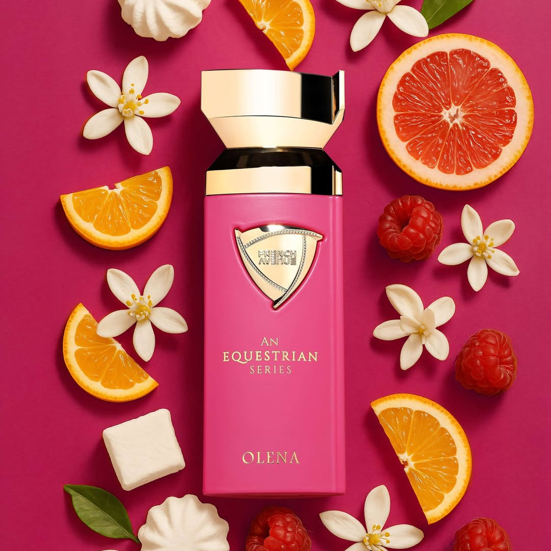 An Equestrian Series Olena by French Avenue is a Floral Fruity Gourmand fragrance for women. This is a new fragrance. An Equestrian Series Olena was launched in 2025. Top notes are Mandarin, Bergamot, Orange and Grapefruit; middle notes are Orange Blossom, Raspberry and Blackcurrant; base notes are Marshmallow, Whipped Cream, Ambrette and Musk.
