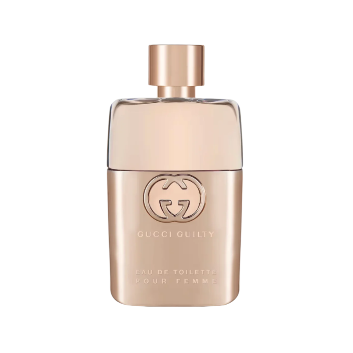 Gucci Guilty Eau de Toilette Pour Femme is presented in the signature, tall and slender bottle shape with rose gold details and a soft pink color of the perfume liquid.
