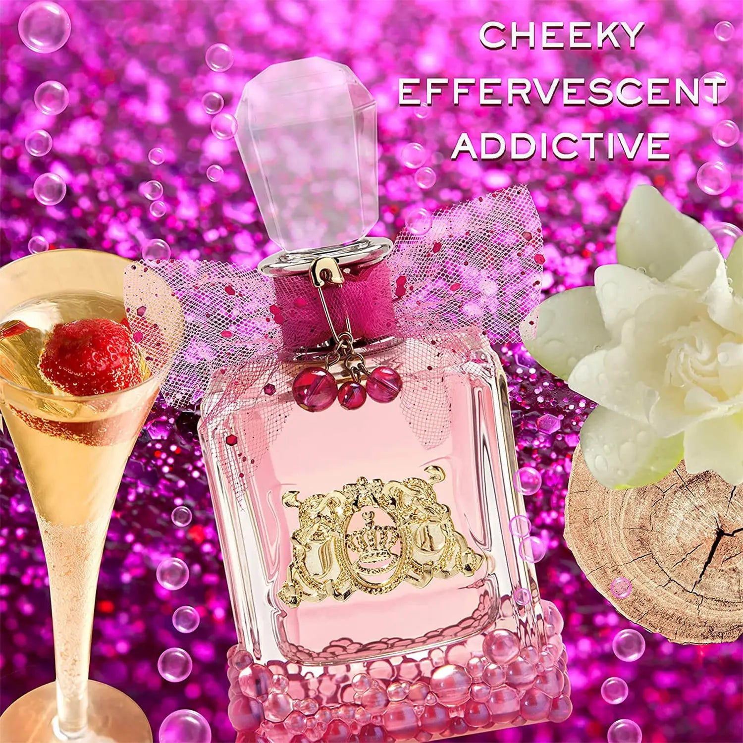 Viva La Juicy Le Bubbly Perfume by Juicy Couture, A floral, fruity and gourmand fragrance for women of all ages, Viva La Juicy Le Bubbly features a signature effervescent note of Champagne.Amber, praline and woodsy notes form the fragrance’s base, a warm, nutty and natural finish that balances the brightness of the introduction.