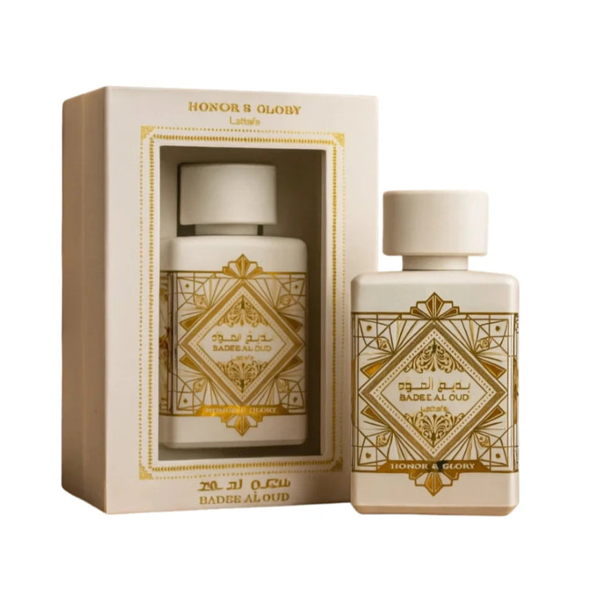 Bade’e Al Oud Honor & Glory by Lattafa Perfumes is a fragrance for women and men. This is a new fragrance. Bade’e Al Oud Honor & Glory was launched in 2023. Top notes are Pineapple and Creme Brulee; middle notes are Cinnamon, Turmeric, Black Pepper and Benzoin; base notes are Vanilla, Sandalwood, Cashmeran and Moss