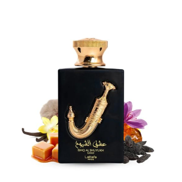 Ishq Al Shuyukh Gold by Lattafa Perfumes is a Oriental Vanilla fragrance for women and men. This is a new fragrance. Ishq Al Shuyukh Gold was launched in 2022. Top notes are Caramel and Saffron; middle notes are Suede, Leather and Tonka Bean; base notes are Vanilla, Amber and Musk.