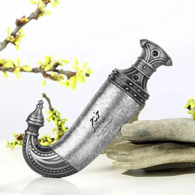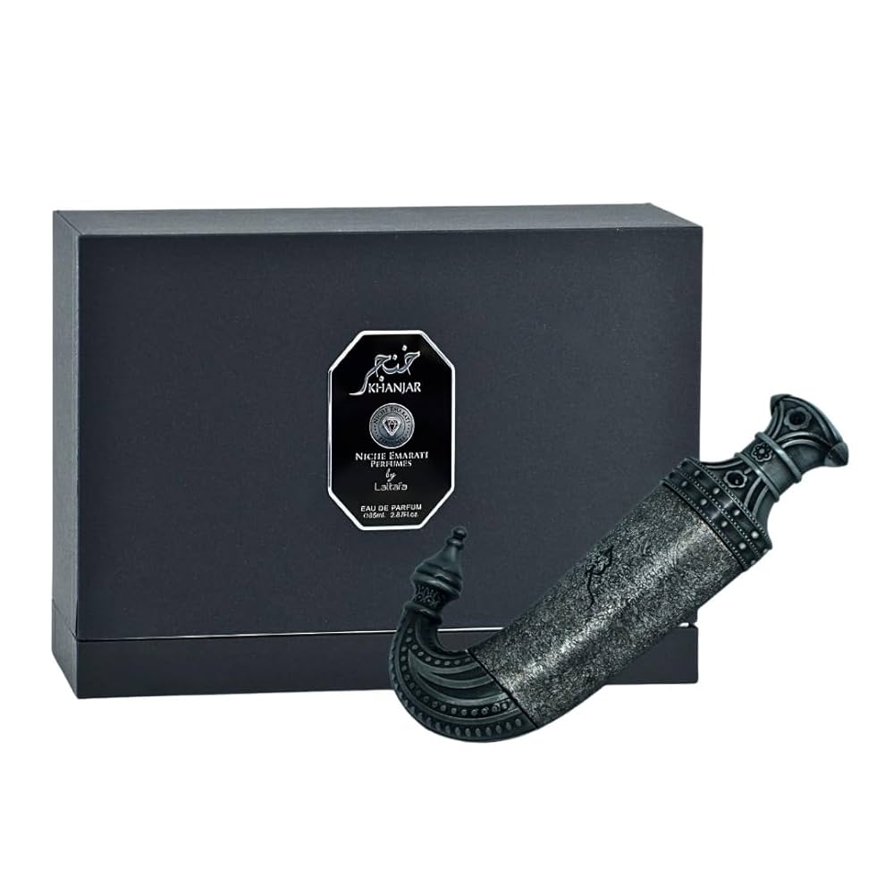 Khanjar by Lattafa Perfumes is a fragrance for women and men. Khanjar was launched in 2023. Top notes are Nutmeg, Pimento and Ginger; middle notes are Violet, Patchouli and Cashmeran; base notes are Leather, Incense, Vetiver and Musk