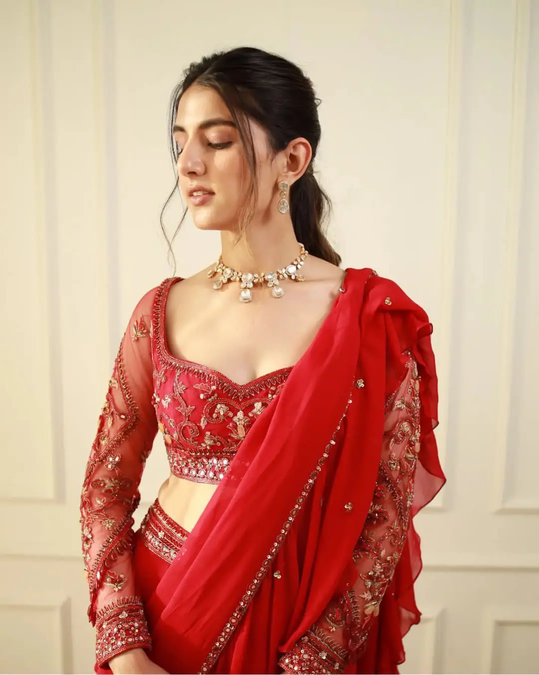 BOUTIQUE STYLE EXCLUSIVE FANCY PARTY WEAR RED PREMIUM GEORGETTE RUFFLE SEQUENCE EMBROIDERY WORK LEHENGA SAREE WITH HEAVY WORK BLOUSE