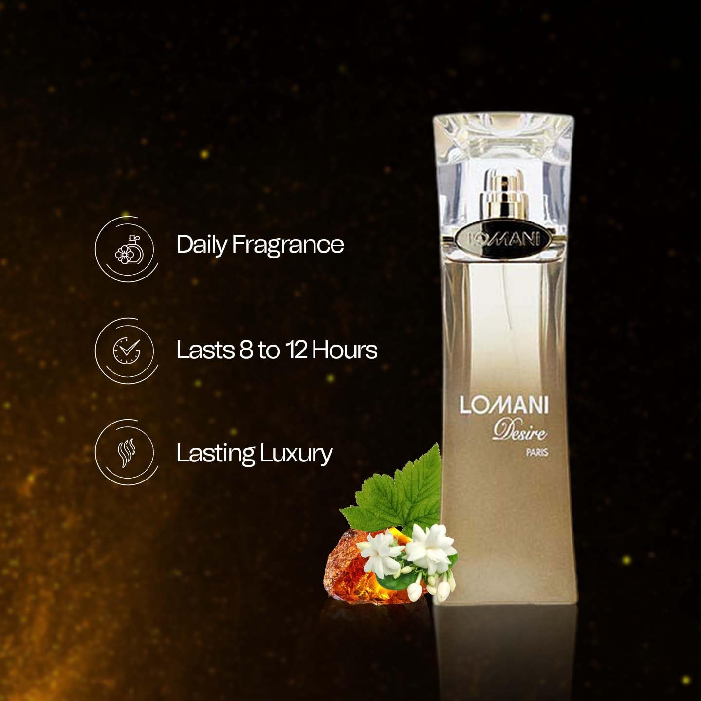 Be the edgy and mischievous woman with the Lomani Desire Eau De Parfum – (100ml). Lemon, orange, and apple are the fruity notes in the perfume’s opening notes. With a hint of raspberry, the fragrance’s heart notes became more vibrant. A gregarious touch of honey and vanilla warms the dry, woodsy notes that are alluring and sensual.