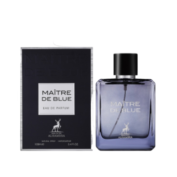 Maître de Blue by Maison Alhambra is a Oriental Woody fragrance for men. Maître de Blue was launched in 2022. Top notes are Grapefruit, Bergamot, Aldehydes, Lemon, Mint and Pink Pepper; middle notes are Ginger, Jasmine, Melon and Nutmeg; base notes are Amber, Patchouli, Agarwood, Labdanum, Incense and Sandalwood