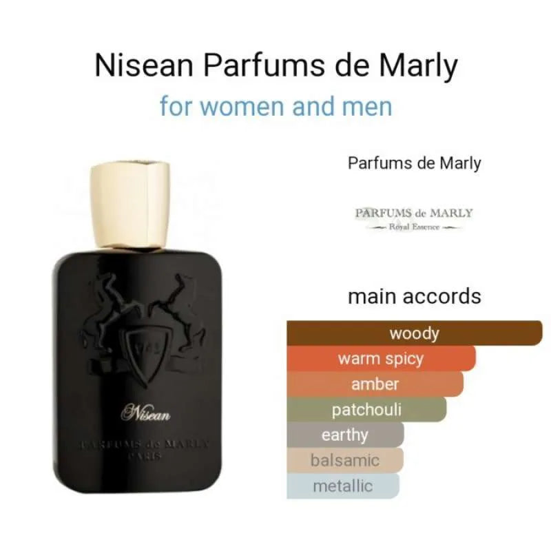 Nisean by Parfums de Marly is a Amber Spicy fragrance for men. Nisean was launched in 2016. Nisean is a tribute to incense resins, cedarwood and patchouli. A luscious combination with sensual leather accords heightened by smoked and milky hints that provide nuance.