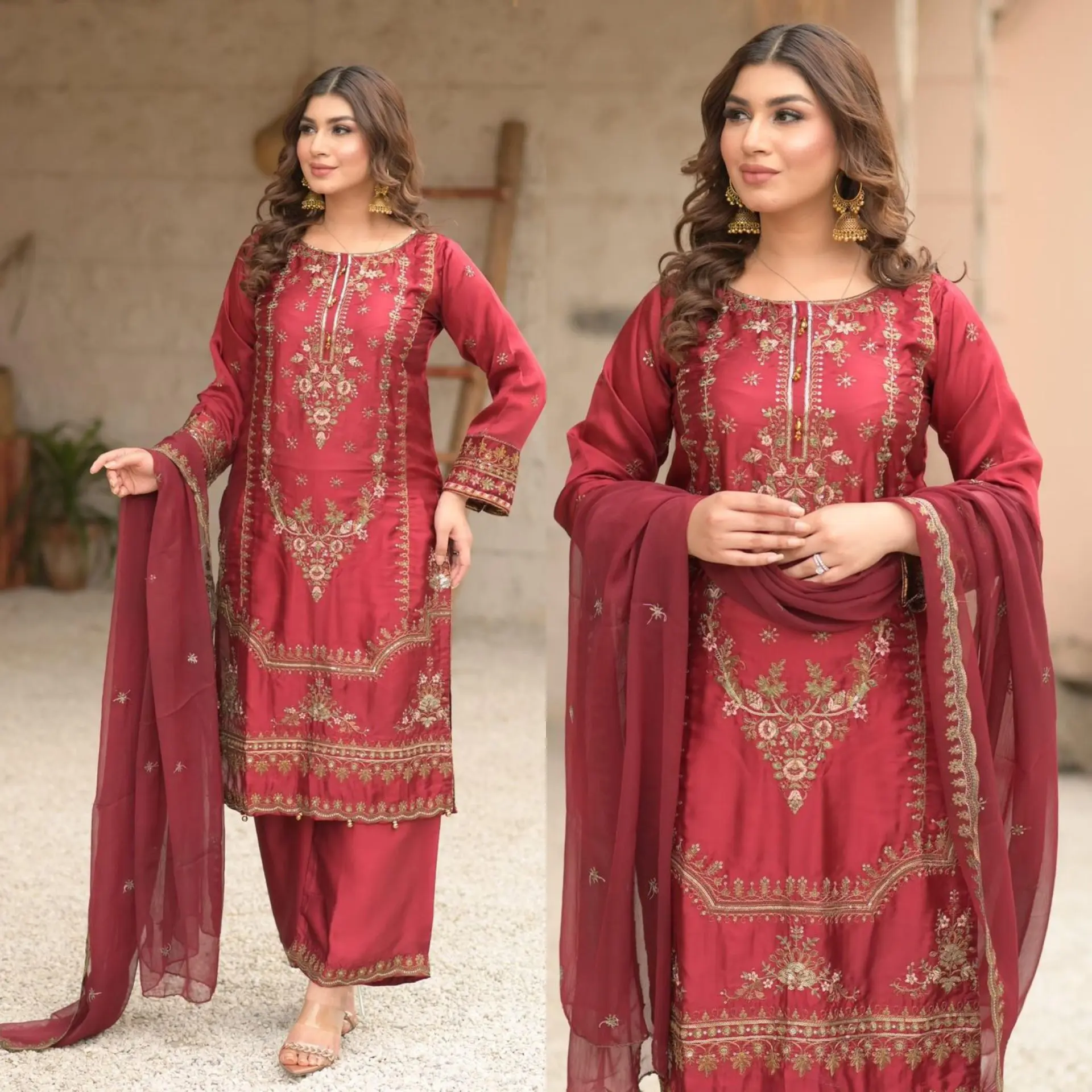 Indulge in the epitome of sophistication with ‘Celestia in Maroon hue’ from Rangoon Clothing’s Raqs-e-Resham Collection. Crafted from sumptuous Silk, this enchanting ensemble boasts intricate panel embroidery adorned with a shower of sequin floral multi-embroidery on the shirt. Paired with an exquisite chiffon embroidered dupatta and a lustrous silk fabric trouser, ‘Celestia’ defines elegance.