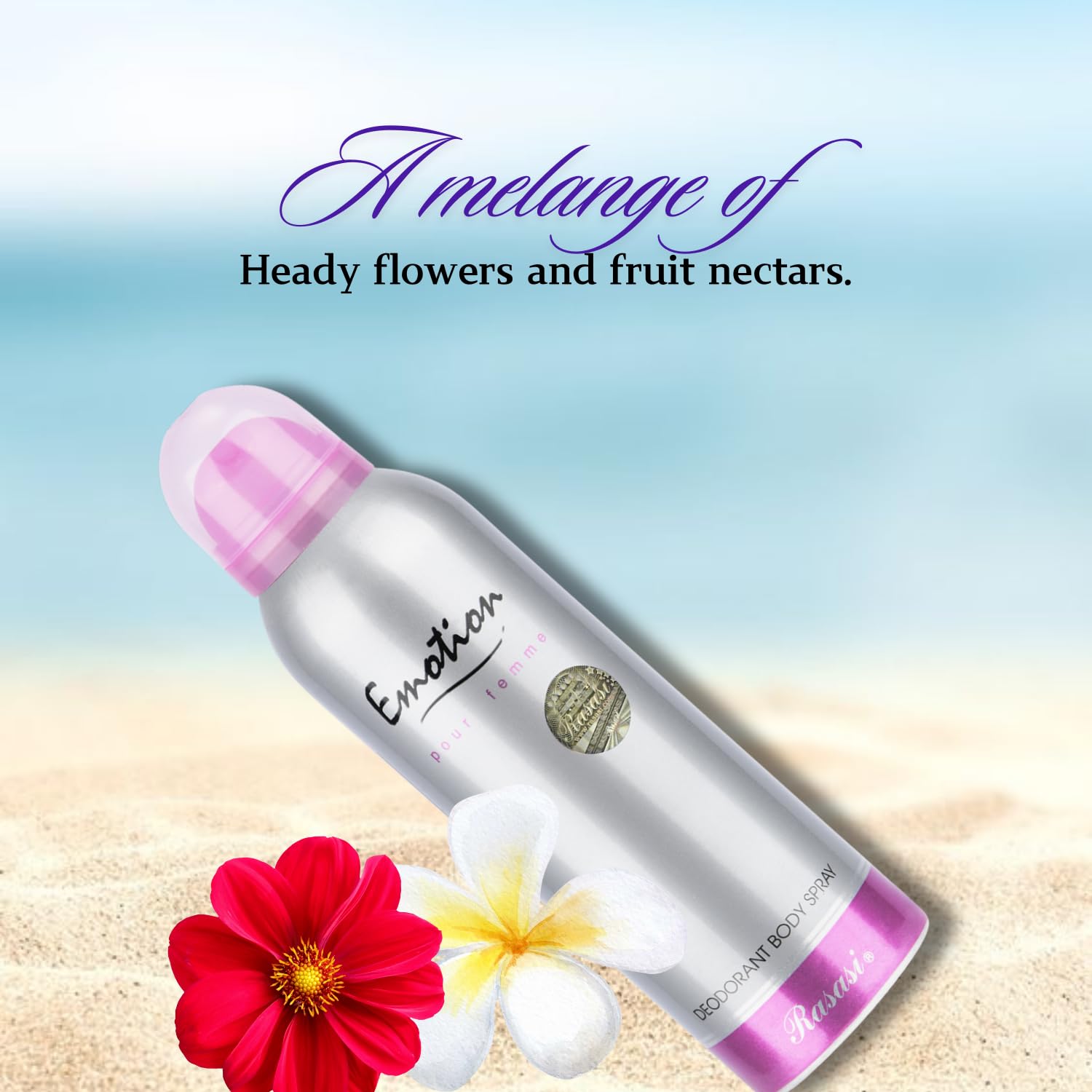 Rasasi Emotion pour Femme a woman living under a lucky star. She is unique, joyful, strong, passionate and always undoubtedly herself. The packaging is very luxurious having rich pearl box. The violet and green colours of the bottle create a mesmerizing fusion of metal and glass. The fragrance is luxurious, powerful and sensual. A melange of heady flowers and fruit nectars.