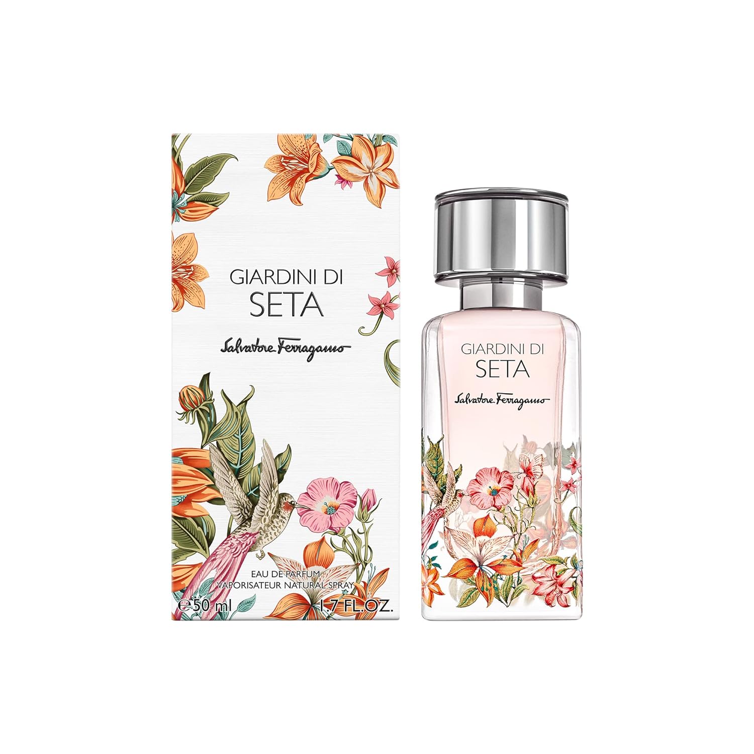 Giardini di Seta is Salvatore Ferragamo’s new olfactory chapter inspired by hidden gardens. A vibrant and luminous Eau de Parfum, this elegant perfume reveals a fascinating, oneiric world between the petals of an artistic olfactory bouquet adorned by refined birds and exquisite flowers.