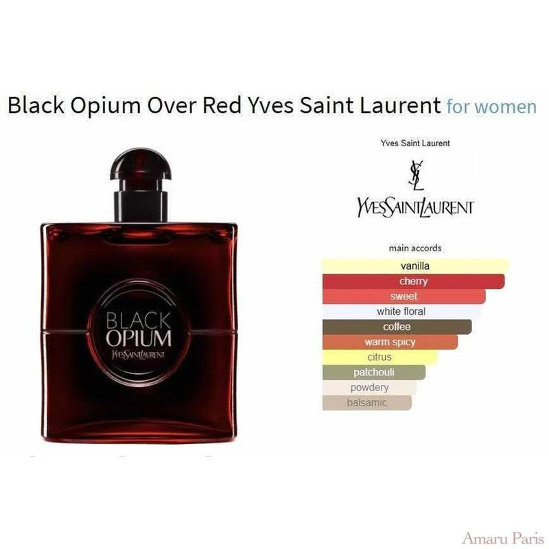 Black Opium Over Red by Yves Saint Laurent is a Floral Fruity Gourmand fragrance for women. This is a new fragrance. Black Opium Over Red was launched in 2024. Black Opium Over Red was created by Honorine Blanc, Nathalie Lorson, Marie Salamagne and Olivier Cresp. Top notes are Cherry and Green Mandarin; middle notes are Jasmine, Orange Blossom and Black Tea; base notes are Madagascar Vanilla, Coffee and Indonesian Patchouli Leaf.